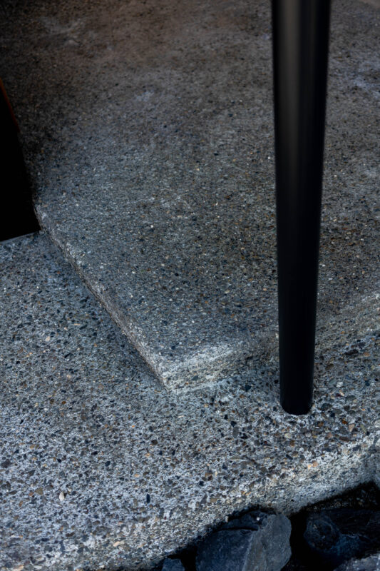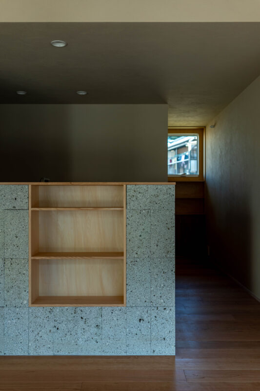 また、外部から玄関が直接見えないよう、エントランスには杉板型枠によるRC擁壁を立ち上げ、外部からの視線をやわらかく遮っています。