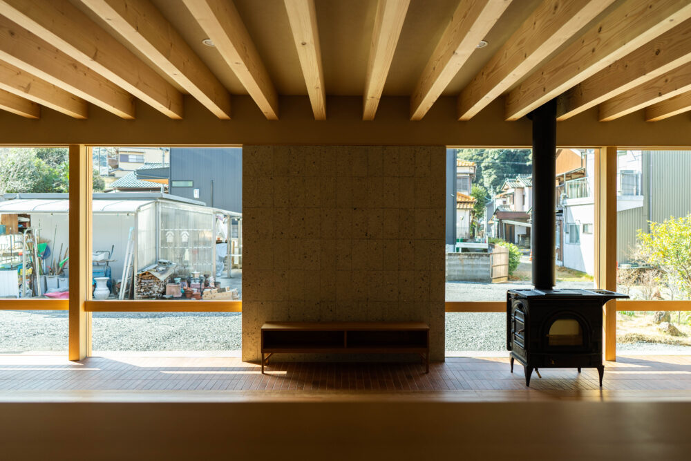 新しい住まいの中心に据え、LDKのどこからでも木製窓を通して見える庭と薪ストーブ、TVが眺められる配置としています。